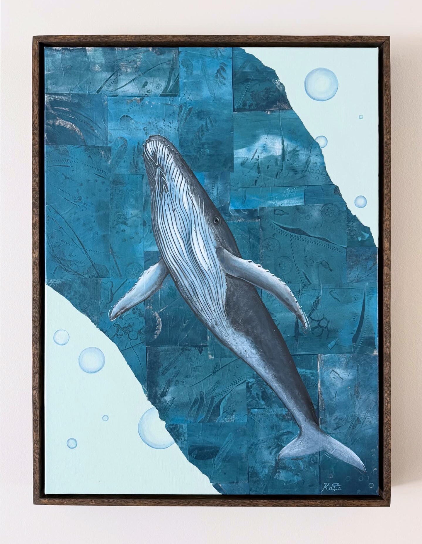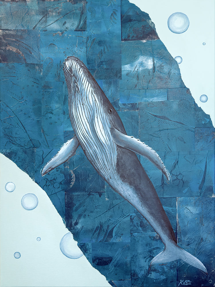 Humpbacks are one of my favourite animals. Every time I see these giants, my heart melts. I wanted to depict the beauty of a humpback in the ocean. Some of the background textures I used were meant to depict waste, such as bottles and plastic bags. Other textures were meant to represent algae and corals. The ripped edges leading to a bare, almost colourless background with only a few bubbles was an allusion to what oceans would look like without life.