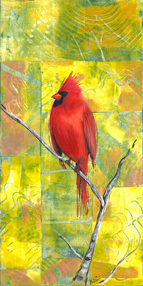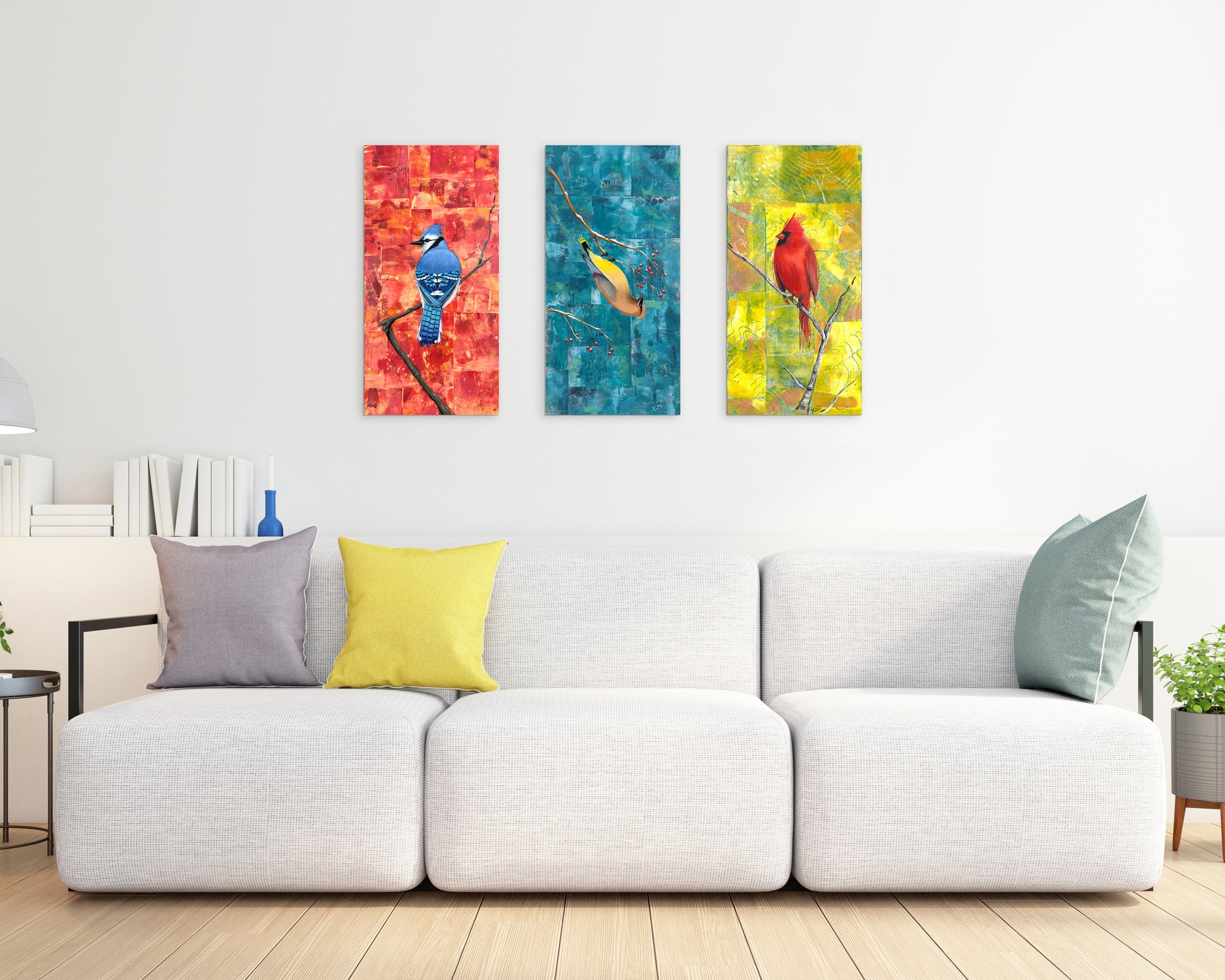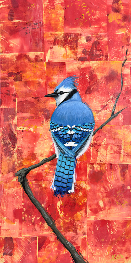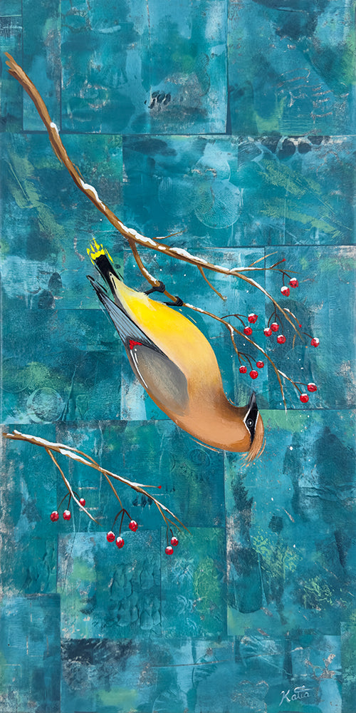 I wanted to paint a series of three birds that would be a statement piece on a wall when displayed together. The cardinal, waxwing and blue jay are some of my favourite birds we have in our backyard here in Ontario. The waxwing can often be observed hanging upside down while eating berries on thinner branches, which make them look like a free spirited bird. For this reason I decided to name the series: Be Yourself.