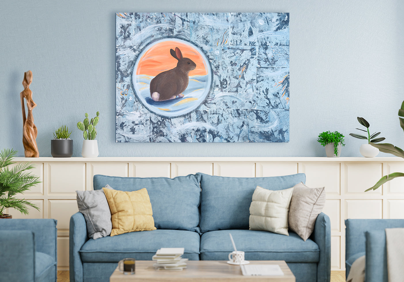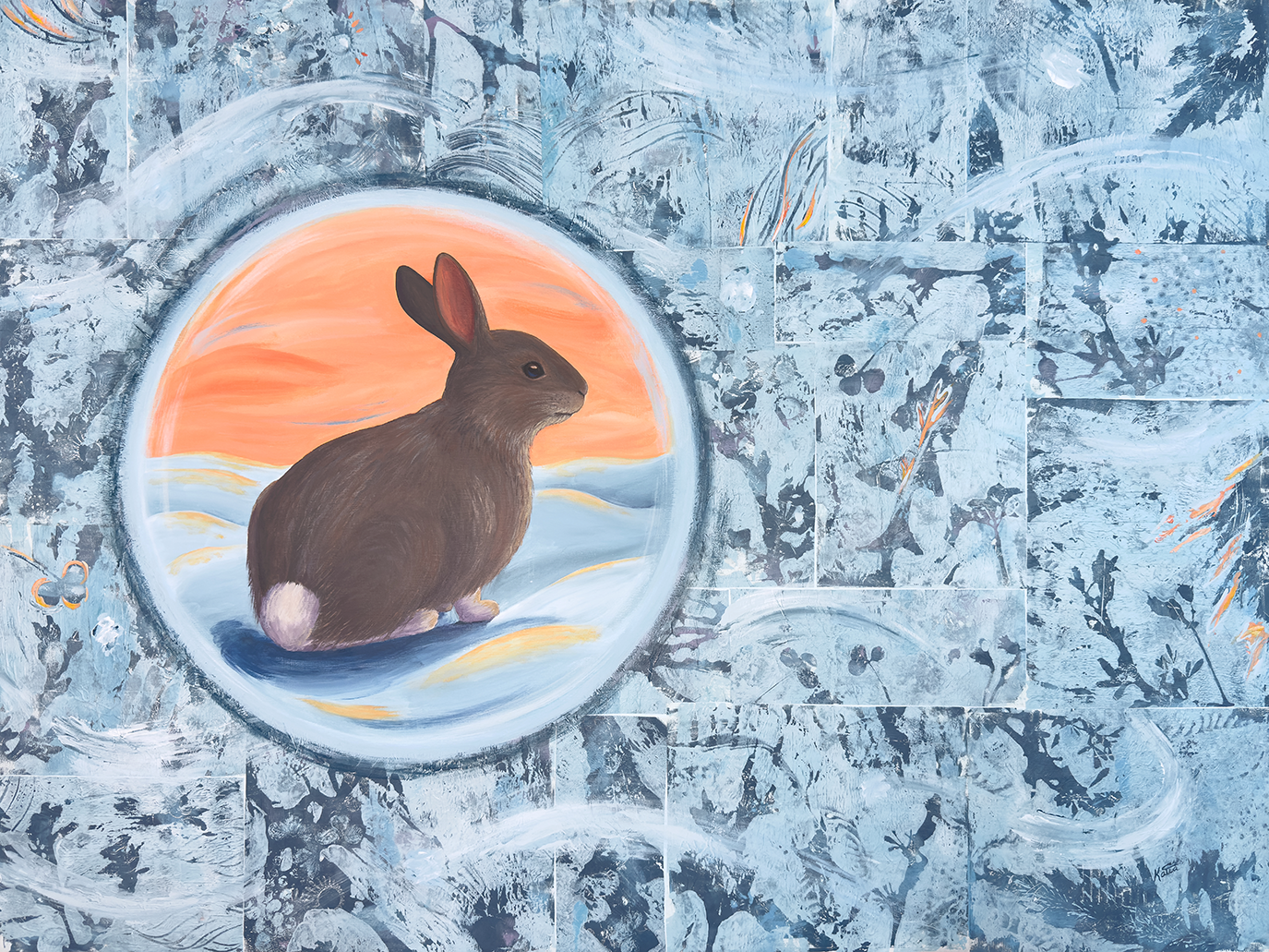 One of the things that fascinate me with Eastern cottontails is their ability to be so still when they feed, despite predators not being too far at times. They almost seem like they live in their own world, or their own bubble if you will. This painting illustrates that sense of peace in a chaotic surrounding.